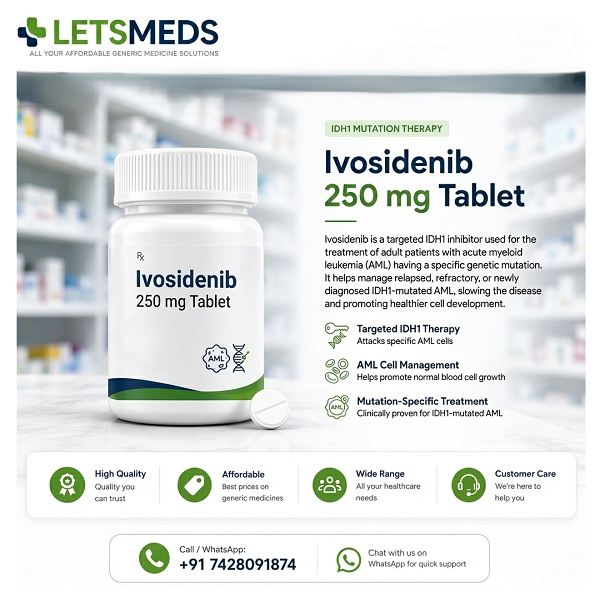 The information provided here is for educational purposes only and should not be considered medical advice. Ivosidenib 250 mg tablets should be used only under the supervision of a qualified healthcare professional. Always consult your doctor before starting or changing any medication. LetsMeds does not promote self-medication and encourages safe and responsible use of all pharmaceutical products.