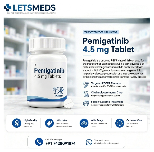 The information provided here is for educational purposes only and should not be considered medical advice. Pemigatinib 4.5 mg tablets should be used only under the supervision of a qualified healthcare professional. Always consult your doctor before starting or changing any medication. LetsMeds does not promote self-medication and encourages safe and responsible use of all pharmaceutical products.